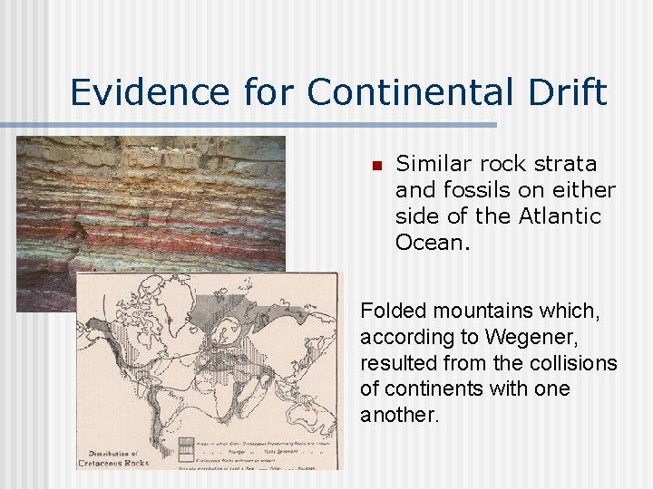 Evidence for Continental Drift n Similar rock strata and fossils on either side of the Atlantic Ocean. Folded mountains which, according to Wegener, resulted from the collisions of continents with one another.