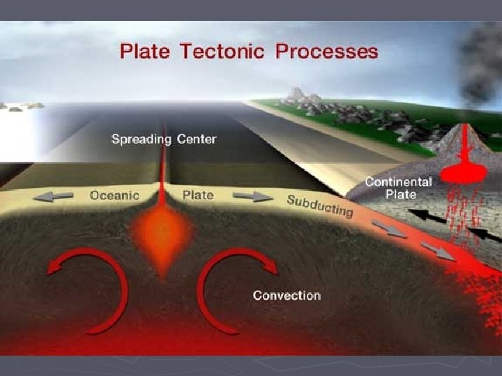Convection Currents ► The Atlantic Ocean getting bigger ► The plates are pulled apart by convection currents in the mantle below ► Caused by heat released from natural radioactive processes ► At the mid-Atlantic ridge molten rock from below rises up to fill the gap with new igneous rock It’s like dumping a box of Kraft Dinner into a pot of boiling water on the stove… ► Plate Tectonics and Convention Currents ►
