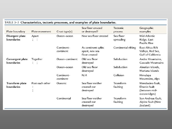 The Theory of Plate Tectonics (cont’d. ) Plate Tectonics - evidence for theory of continental drift by Hess, Heezen and Tharp (1960’s) found lithospheres plate boundaries that can be 3 types: 1) ridges (spreading centers) 2) trenches (subduction zones) 3) transform faults (plates sliding past one another)