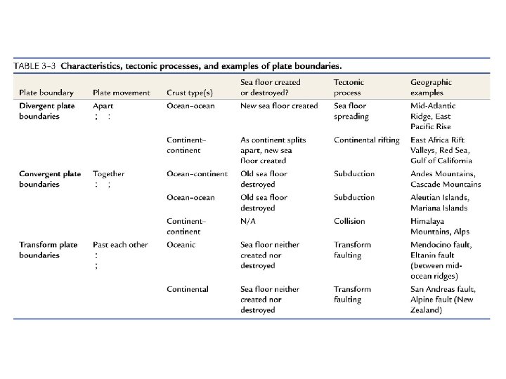 The Theory of Plate Tectonics (cont’d. ) Plate Tectonics - evidence for theory of continental drift Hess, Heezen and Tharp (1960’s) found lithospheres plate boundaries, 3 types: 1) ridges (spreading centers) 2) trenches (subduction zones) 3) transform faults (plates sliding past one another)