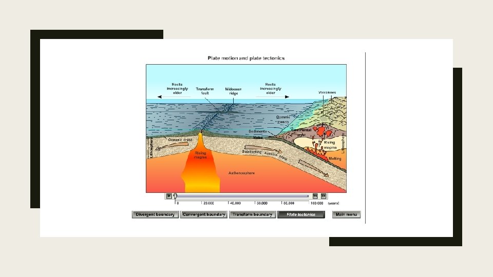 HOW PLATE MOVES 1. Hot mantle from the two adjacent cells rises at the ridge axis, creating new ocean crust. 2. The top limb of the convection cell moves horizontally away from the ridge crest, as does the new seafloor. 3. The outer limbs of the convection cells plunge down into the deeper mantle, dragging oceanic crust as well. This takes place at the deep sea trenches. 4. The material sinks to the core and moves horizontally. 5. The material heats up and reaches the zone where it rises again.