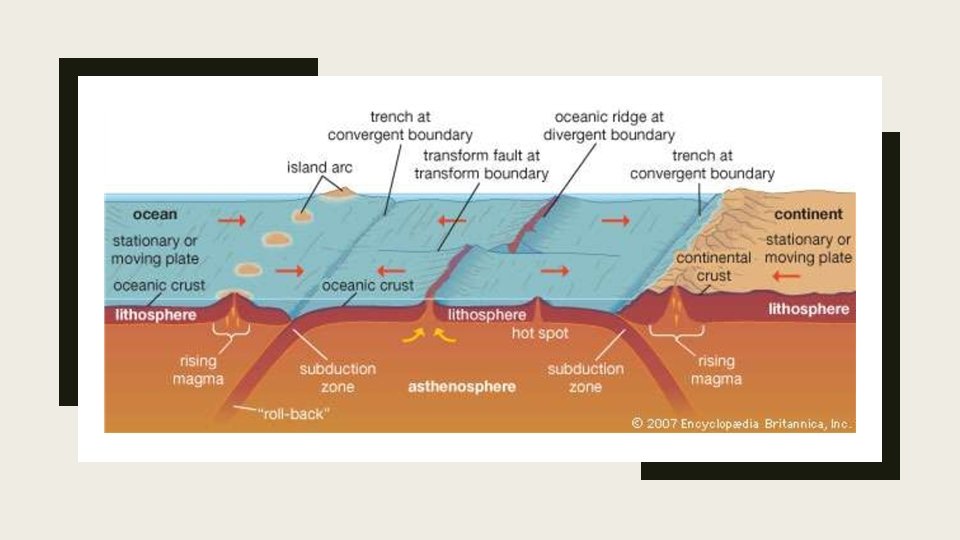 PRINCIPLES OF PLATE TECTONICS Plate-tectonic theory is elegantly simple. Earth’s surface layer, 50 to 100 km (30 to 60 miles) thick, is rigid and is composed of a set of large and small plates. These plates constitute the lithosphere, from the Greek lithos, meaning “rock. ” denser) layer of plastic partially molten rock known as the asthenosphere, from the Greek asthenos, meaning “weak. ” Plate movement is possible because the lithosphere-asthenosphere boundary is a zone of detachment. As the lithospheric plates move across Earth’s surface, driven by forces as yet not fully understood, they interact along their boundaries, diverging, converging, or slipping past each other. While the interiors of the plates are presumed to remain essentially undeformed, plate boundaries are the sites of many of the principal processes that shape the terrestrial surface, including earthquakes, volcanism, and orogeny (that is, formation of mountain ranges).