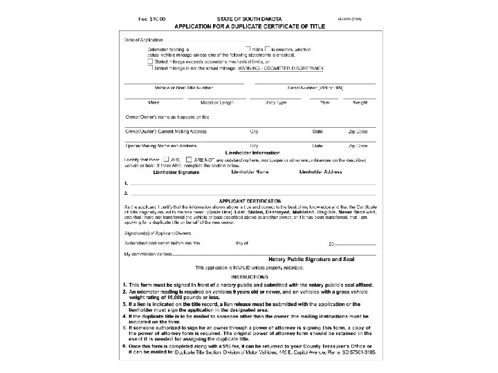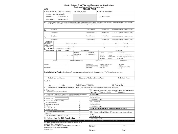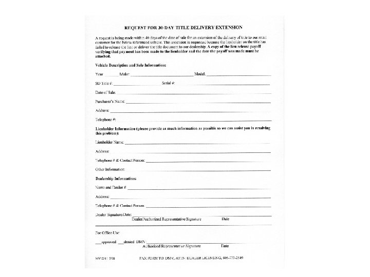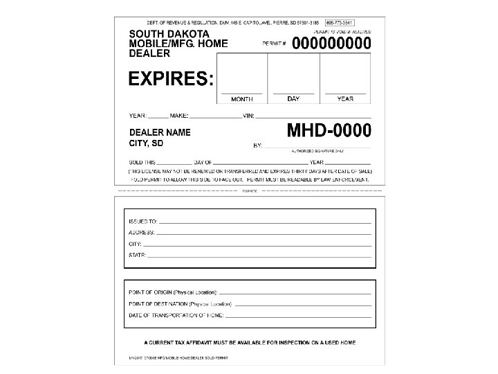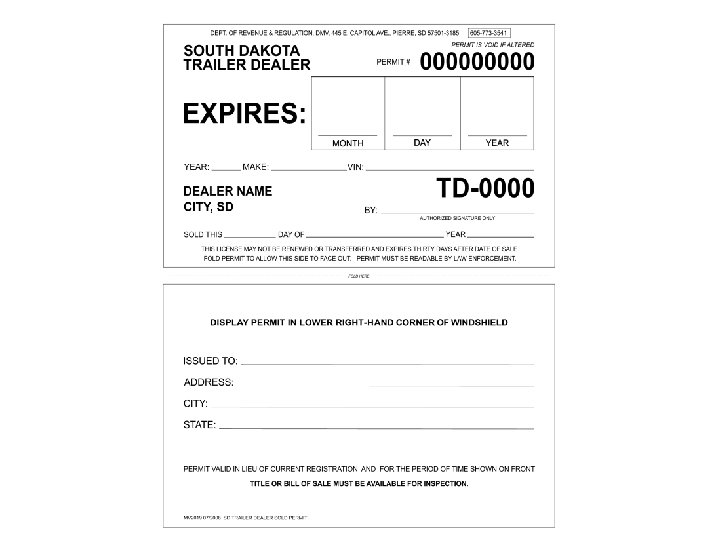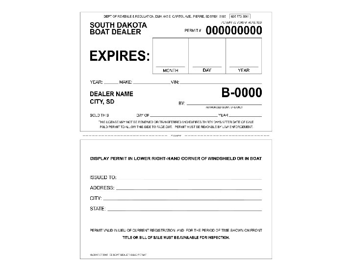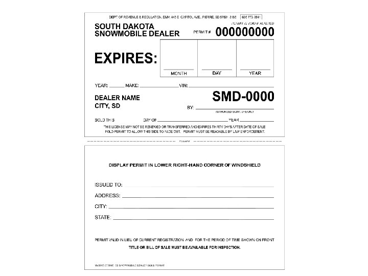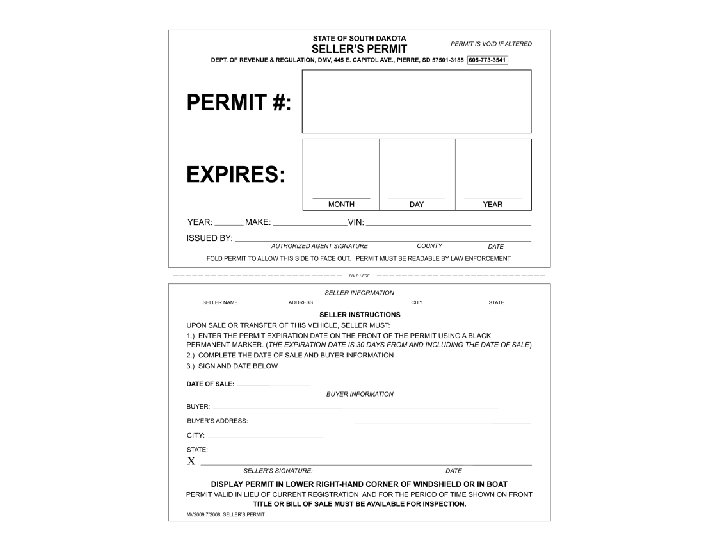 Seller’s Permit • A private seller must obtain a temporary permit for a purchaser to use during the interval between purchase and registration. • The permit is valid for 30 days from date of sale. • No fee is assessed, as the registration fees are assessed back to date of sale.