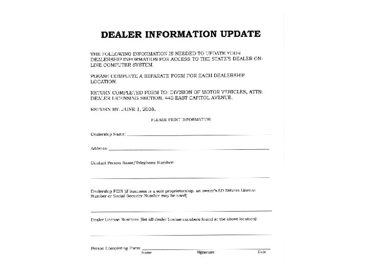 Spreading the Word • Mailings - • June Renewal Notices • Dealer Manuals, Legislative Update, Brochures/Posters/Business Cards • Internet – SDcars. org • Title and Registration Procedures Manual, Forms, Information • Media - Newspapers, Radio, Public TV • Training Classes - Counties, Dealers, Others