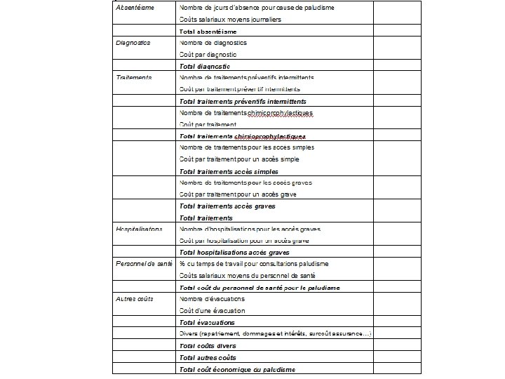 Coûts pour l’entreprise Absentéisme : – coûts directs pour les employés malades : • • – – nombre de jours de travail perdus pour cause de paludisme estimation de l’absentéisme dont la cause est le paludisme coûts des remplacements d’absents : recrutement, formation, gestion coût de la « débilitation » palustre Coûts directs des : – – traitements hospitalisations funérailles et coûts liés aux fatalités évacuations et rapatriements Coûts indirects liés aux enfants d’employé(e)s malades montant des primes d’assurance-maladie le cas échéant