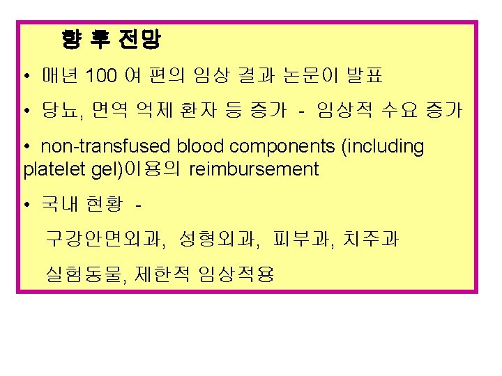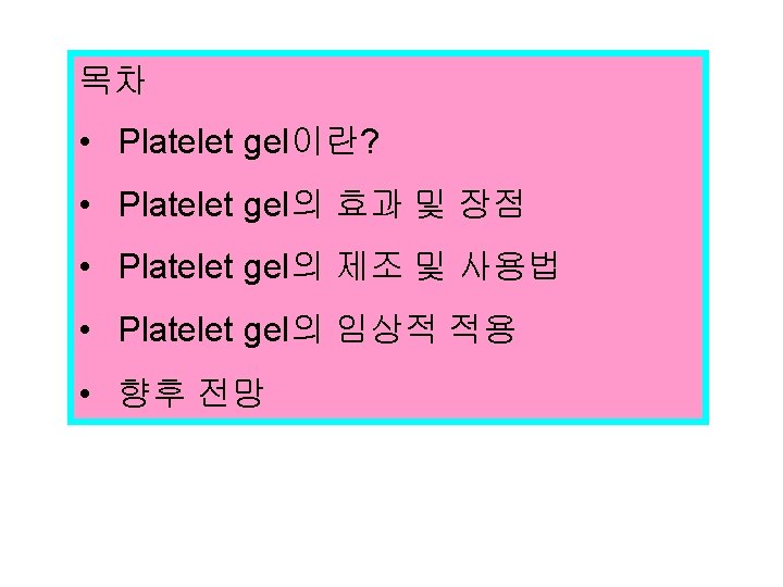 Platelet gel의 임상적 적용 Orthopaedic Surgery: Total Joint Replacement (Hips/Knees) Spinal Fusion Laminectomy Fractures, Non-Union/Bony Defects Oral Surgery, Peridontal, Dental Implant Surgery: Mandibular Reconstruction/Bone Grafts Le. Fort Fractures (Guerin's Fracture) Sinus Lifts/Naso-Alveolar Repair Dental Implants General Surgery: Hepatic Lobectomy/Wedge Pancreatic Surgery/Whipple Procedure Enterocutaneous Fistulas Mastectomy/Axillary Dissection Neurosurgery: Craniotomy Transphenoidal Hypophysectomy Pituitary Tumor Dural Repair LP Shunt/Cerebrospinal Fluid Leak