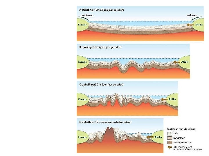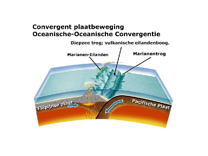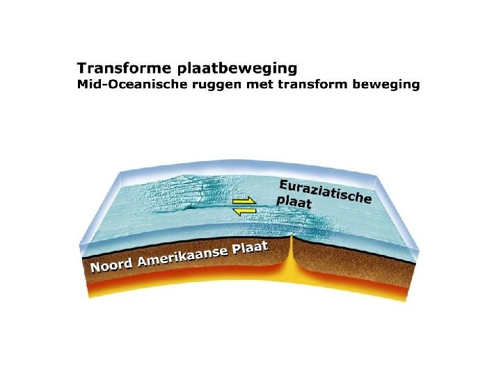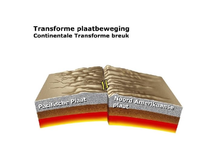 Het verschuiven van platen kan op drie manieren! Transforme breuk Divergerende breuk Convergerende breuk Platen kunnen langs elkaar schuiven Platen kunnen spreiden (= uit elkaar gaan) Platen kunnen botsen Midoceanische rug (spreiden van twee oceanische platen) Subductie (botsen continentale plaat met oceanische plaat) Gebergtevorming (botsen twee continentale platen) Slenk (spreiden twee continentale platen)
