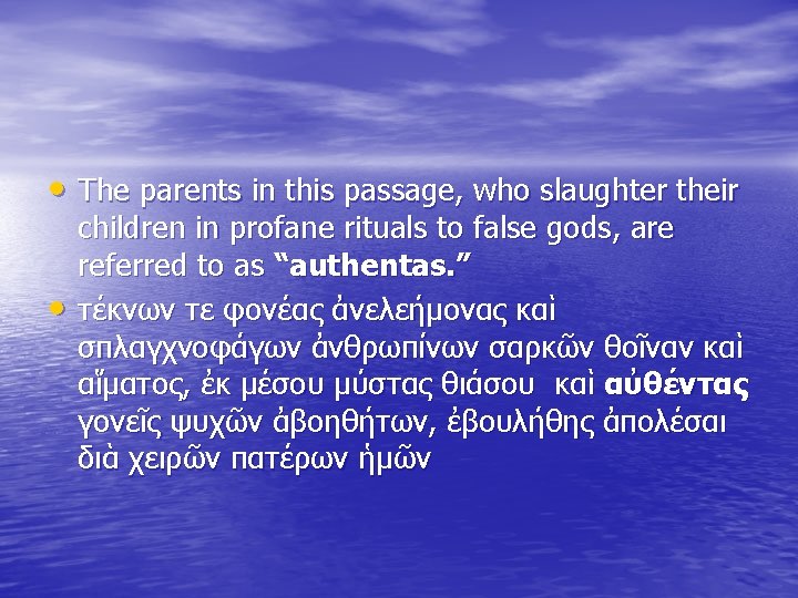 • In the Septuagint, a noun form of “authentein” is • used in following passage: “Do you remember the ancient inhabitants of your holy land? You scorned them for their unholy ways, for their sorcery and profane rituals, their callous killing of children, their cannibal feasts on human flesh and blood. They practiced secret rituals in which parents slaughtered their own defenseless children” (Wisdom of Solomon 12: 3 -6, TIB).