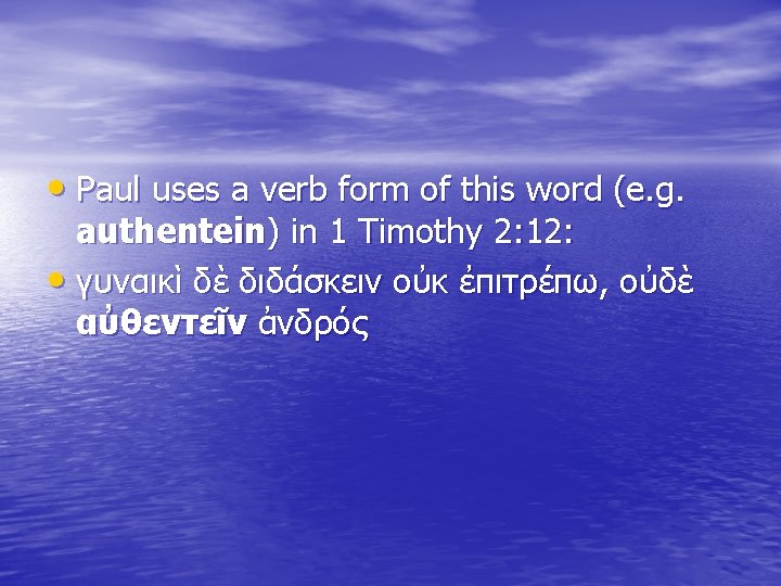 • When we remove the interpretive lens of Plato's worldview, however, how might we view this passage? • According to a study of over 300 uses of the word “authentein” in Greek literature around the New Testament era, the word was more commonly linked to acts of violence, murder, suicide and/or sacrilege.