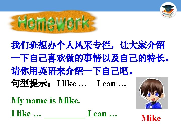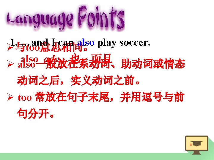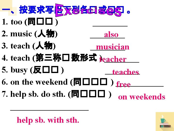 e. g. My brother likes tennis, too. = My brother also likes tennis. 我弟弟也喜欢网球。 I’m very busy today, too. also very busy today = I’m __________. 今天我也很忙。