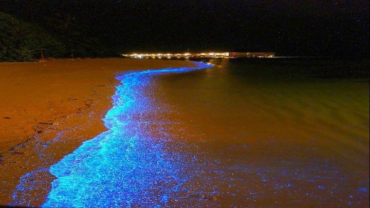 LA PLAYA DE LAS MALDIVAS BRILLAN EN LA OSCURIDAD Die kleinen blauen Lichtern auf dem Strand auf den Malediven werden von Phytoplankton, biolumineszenten mikroskopischen Pflanzen verursacht die das Licht abstrahlen, wenn es von den Wellen bewegt wird. Gilt als der schönste Strand der Welt.