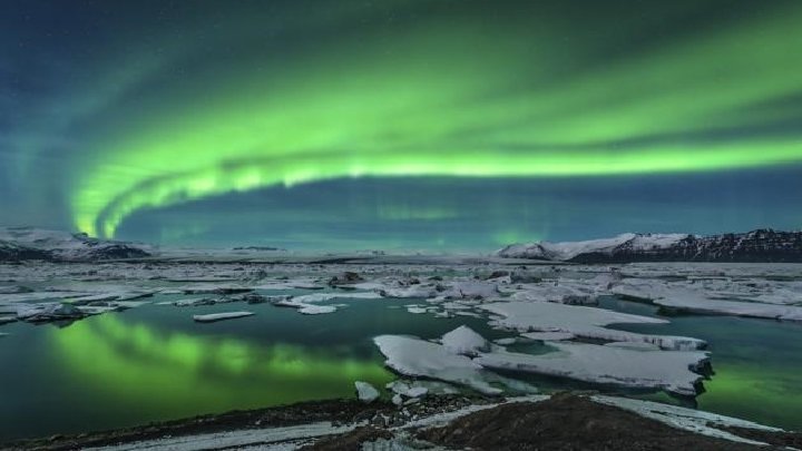 PLAYA EN EL LAGO JOKULSARLON ISLANDIA Der Strand von schwarzen vulkanischen Sand kontrastiert mit Stücken von weißem und glasigen Eis.