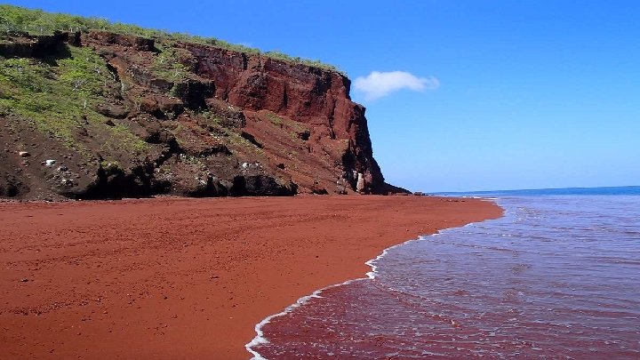 PLAYA DE ARENA ROJA ISLAS GALÁPAGOS Red Sand am Strand von Rabida Insel wurde durch die Oxidation von Eisenreichem Vorkommen an Lava gebildet wurde, aber es könnte auch sein, dass diese Korallensedimente sind.