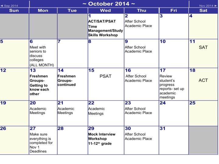 ~ September 2014 ~ ◄ Aug 2014 Sun Mon Tue Wed Oct 2014 ► Thu Fri Sat 1 2 3 4 5 6 7 8 Scheduling Conflicts New entrantsschedules, tours, lockers, etc. 9 Scheduling Conflicts New entrantsschedules, tours, lockers, etc. 10 Scheduling Conflicts 11 Scheduling Conflicts 12 13 14 15 16 Meet the teacher night 17 Meet the teacher night 18 19 Retention meetings with parents. 20 22 Student Mediations : Class Bullying, fighting, inappropriate language/behavior s, 23 Student Mediations : Facebook, Cyber bullying, Bus Issues 24 25 Portfolio and Resume Prep. 26 27 29 30 Meet with administration to plan/review upcoming yearly guidance activities (Push-In lessons, assemblies, College Fair, Financial Aid Night, etc. ). 21 28 Crisis Interventions (i. e. self-esteem, suicide, depression, anxiety, divorce, bullying, bereavement, home life conflicts, etc. ). Send out letter to parents informing them about upcoming College Night including college applications/deadlines. Retention meetings with parents.