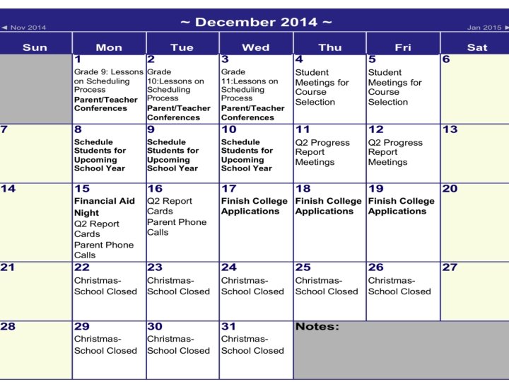 Academic ¡ Scheduling Conflicts ¡ New entrants-schedules, tours, lockers, etc. ¡ Meet with administration to plan/review upcoming yearly guidance activities (Push-In lessons, assemblies, College Fair, Financial Aid Night, etc. ). ¡ Meet the teacher night. ¡ Send out letter to parents informing them about upcoming College Night including college applications/deadlines. Outcomes: Preparing our students and their families for the upcoming academic semester by ensuring they are properly advised and informed.