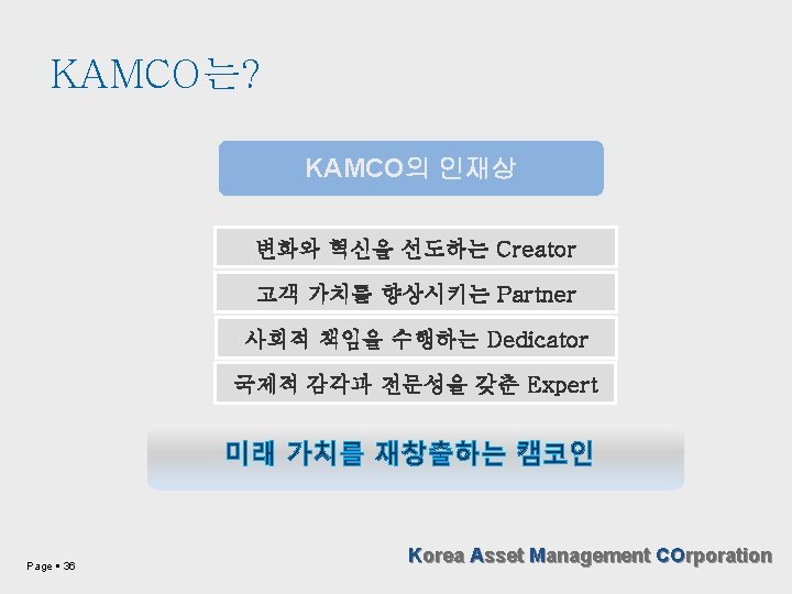 미래 인재상 Creativity Special & Generalist Capability Contents (Spec ☓) 전공 및 인문학적 소양 개인능력이 조직발전 견인 Quality (Quantity ☓) Cross-Over 직무 중심 (직업 ☓) Flexible (Fixed ☓) 평생 교육 성과 중심 Page 35 Korea Asset Management COrporation