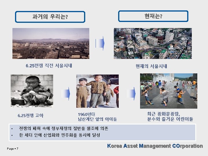 우리 경제의 발전 추이 GDP 연도 1953 1962 1970 1988 2010 2040 GDP 13억 27억 636억 1, 923 억 10, 143억 2조 7, 900억 67* 104 279 4, 548 20, 591 1인당GDP (1인당 GNI) 60, 000 자료: KDI전망 국민소득(GNI) 1인당GDP의 국가간 비교(단위: 달러) 1인당 GDP 가 나 필리핀 중 국 태 국 브라질 가 봉 그리스 일 본 미 국 180 152 70 110 230 340 630 610 3, 110 자료 : World Bank, 한국은행 Page 6 한국 미국 일본 영국 95→ 07(12년) 1만불→ 2만불 78→ 88(10년) 81→ 87(6년) 87→ 96(9년) → 10(재진입) 2만불→ 3만불 10→ ? 88→ 97 (9년) 87→ 92(5년) 96→ 03(7년) 1, 312 2, 007 4, 382 4, 992 10, 816 8, 724 27, 302 42, 820 47, 284 ? Korea Asset Management COrporation