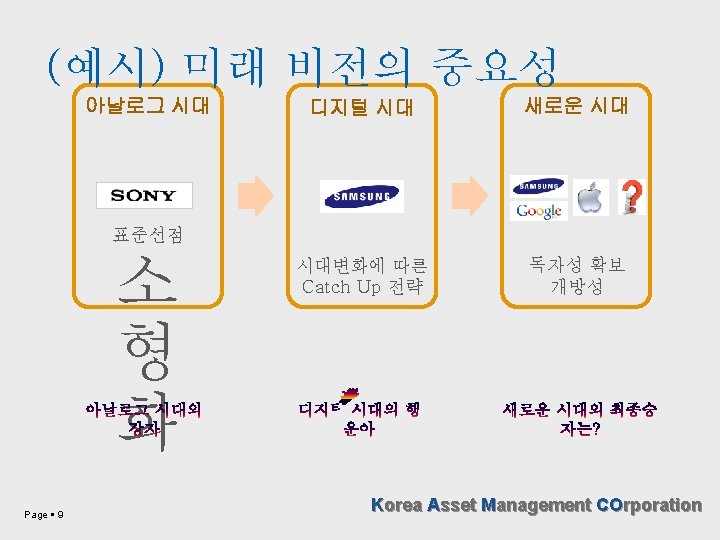 미래의 정의 아직 오지 않은 것 ← 소극적 과 거 현 재 과 거 VS 적극적 → 다가오는 것 미 래 현 재 미 래 ☞ The best way to predict the future is to create it. (Peter F. Drucker) Page 5 Korea Asset Management COrporation