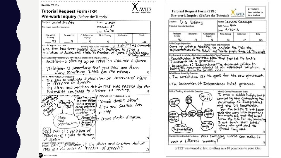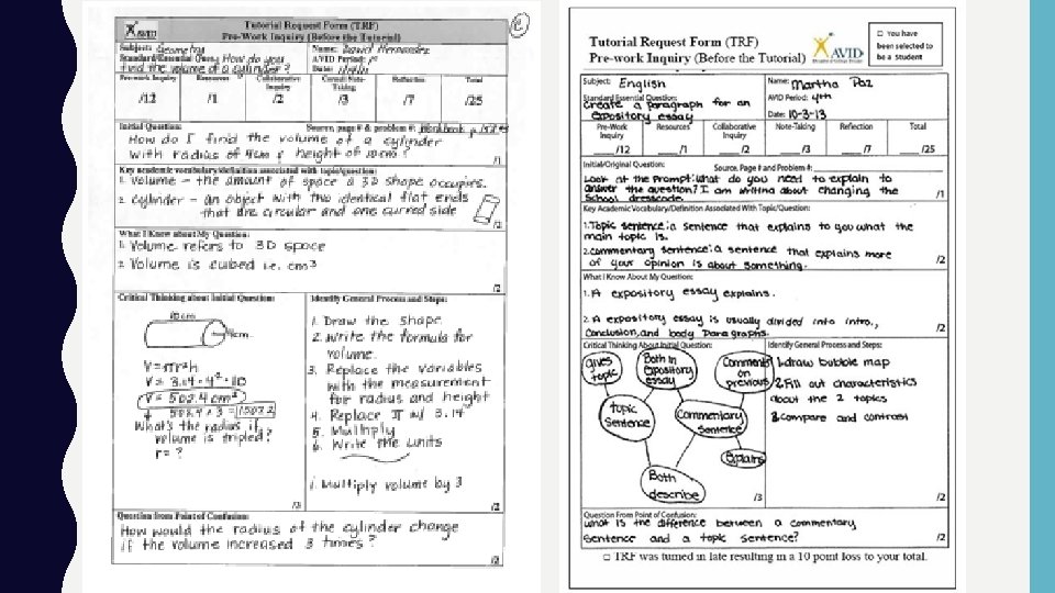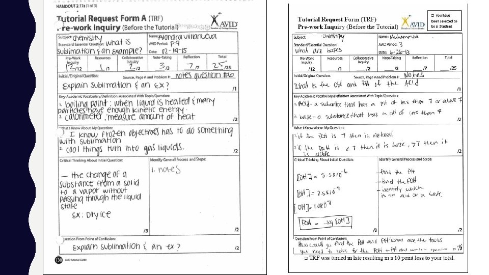HOW DO AVID TUTORIALS DIFFER FROM TRADITIONAL “TUTORING? ” * All students must arrive to tutorials prepared with the pre-work completed and specific questions written in a Tutorial Request Form (TRF). If they believe they have no questions regarding any homework, schoolwork, quiz or test in any of their classes, they must still attend the tutorial with a completed TRF in which they ask a question that further explores the material they are studying in any of their classes. * Questions are high level thinking questions. * Students work and discuss in collaborative group. * Students must reflect on their own participation in the groups and on how the group worked together.