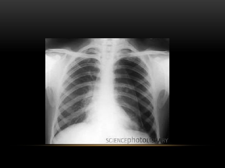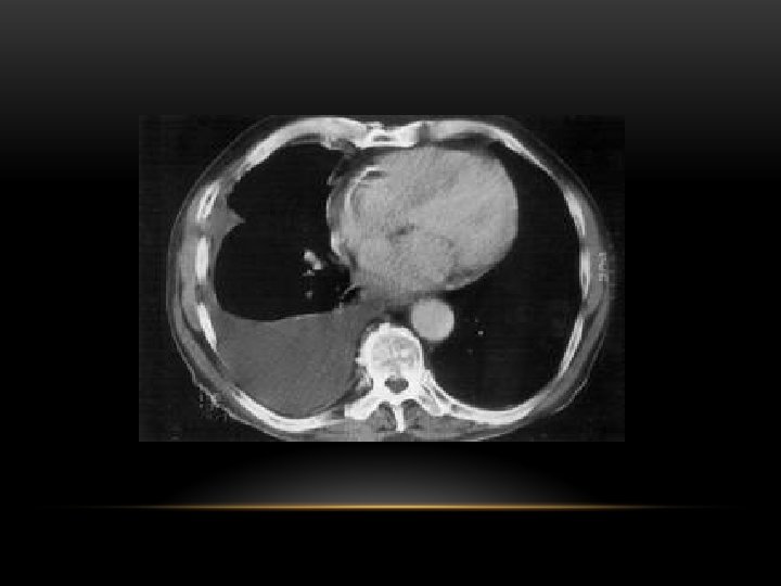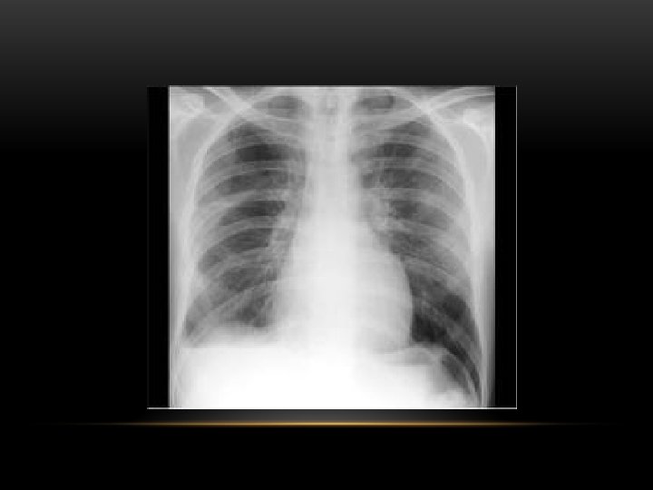 Pneumothorax • No vascular markings on right • No shift of mediastinum to left • Atelectasis right lung • Increased haziness on left: Diversion of entire cardiac output • Small fluid level near costophrenic angle: Hydro pneumothorax