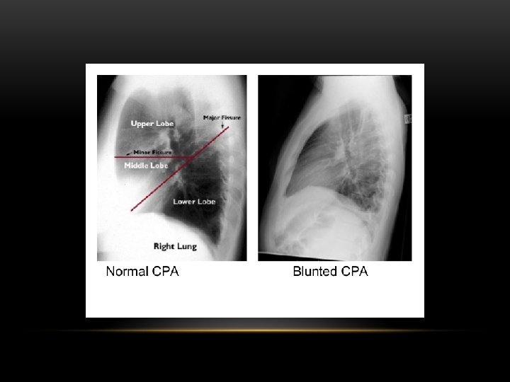 Pleural Effusion Fluid accumulates in the pleural space. Irrespective of the nature of fluid, radiologically they will look similar. Radiological criteria are: Density In dependent portion (Costophrenic angle in PA view). Blunting of costophrenic angle Lack of identifiable diaphragm (silhouette sign principle).