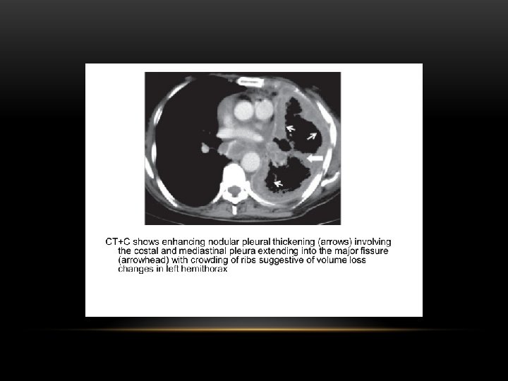 pleural masses Multiple • Pleural metastases. • Asbestos related pleural disease: Look for calcifications. • Malignant mesothelioma. Solitary • Pleural metastases: • Solitary fibrous tumor of the pleura. • Lipoma. • Malignant mesothelioma: