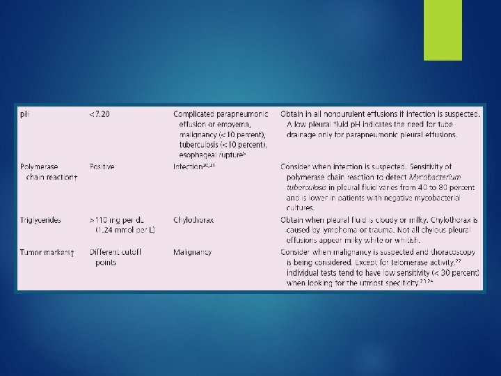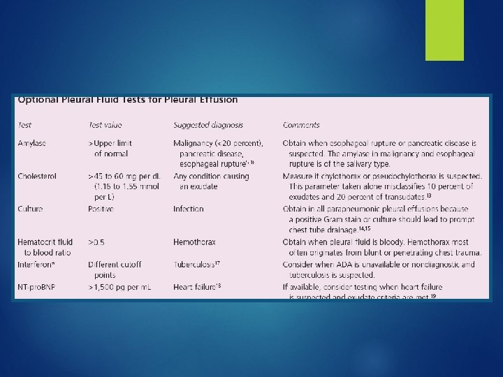 Cell count Lymphocytic (> 50%) CA (30 -35%) TB (15 -20%) Trauma Sarcoidosis PTX CA Asbestos, parasites Pneumonia PMNs Empyema Parapneumonic Rheumatoid Pulmonary infarction Eosinophilic (> 10%) PMN or Lymphocytic RBC > 100, 000/mm CA Conn tissue disease Trauma Post-cardiac injury Pulmonary infarction PE