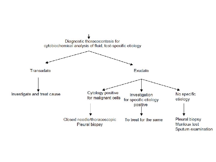 Thoracentesis and cytobiochemical fluid analysis • Indication – Larger than 1 cm on lateral decuibitus or USG – Not in b/l as strong suspect for transudate, unless there atypical features or patient fails ro respond • Diagnostic tap for biochemical, cytological and microbiological exam is needed for correct dx. • Differentiation b/w transudate and exudate is crucial before further tests are undertaken.