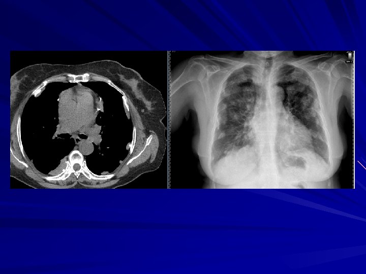Ayakta PA akciğer grafisi Saptayabilmek için gerekli minimum miktar – 175 m. L Bazen 500 m. L sıvı bile görülemeyebilir Bulgular: – – – Diyaframın yükselmiş gibi görünmesi Kostofrenik sinüsün kapanması Menisküs bulgusu Üst kenarı konkav opasite – Masif effüzyon: Opak hemitoraks Mediastenin karşıya itilmesi – Atelektazi varsa olmayabilir