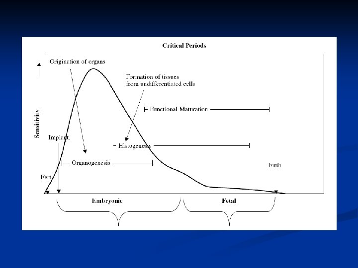 Teratogenesis (cont. ) Dose-effect relationship Ø Teratogens may demonstrate a dose-effect relationship. Ø With most agents, a dose threshold for teratogenic effects has not been determined. Ø Teratogens must reach the developing conceptus in sufficient amounts to cause their effects it depends on its m. wt. , polarity, lipid solubility and the existence of a specific protein carrier. FDA Classifications of Drug Risk A. No fetal risk shown in controlled human studies in all trimesters. B. Animal studies show a risk that is not confirmed in human studies during all trimesters. C. Fetal risk shown in controlled animal studies but no controlled human studies are available or studies in humans and animals are not available. D. Studies show fetal risk in humans (use of drug may be acceptable even with risks). X. Risk to fetus clearly outweighs any benefits from these drugs. Examples of teratogenic agents Ø Thalidomide (X). Limb defects and other congenital anomalies Ø Warfarin (D). Skeletal abnormalities (curvature of the spine) and Limb abnormalities. Ø Aminoglycosides (C) at high dose. VIII cranial nerve damage. Ø ACE inhibitors (D). Renal tubular dysplasia, skull and pulmonary hypoplasia. Ø Antineoplastics (D). Growth retardation, cleft palate, eyes, kidney, cardiac, limbs, skull defects. Ø Retinoids (X). H eart defect, spontaneous abortion, microtia or cognitive defects. Ø Other teratogenic agents as Ionizing radiation, infections (virus, syphilis, toxoplasmosis), metabolic imbalance (alcoholism, diabetes, folic acid deficiency, iodine deficiency,