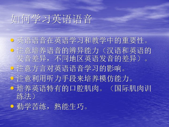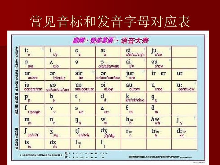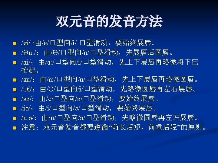 单词重音 I. 单重音 1、放在词首 modern people industry interesting 2、放在第二音节 begin success republic II. 主重音与次重音 magazine university interfere III. 双重音 Chinese thirteen IV. 单词采用单重音或双重音会导致含义不同 black board-blackboard/ green house-greenhouse/ white house. Whitehouse V. 由于词性不同而导致重音位置不同(名词和形容词重音在词首, 动词重音在第二音节) desert produce perfect