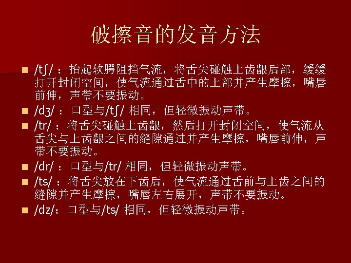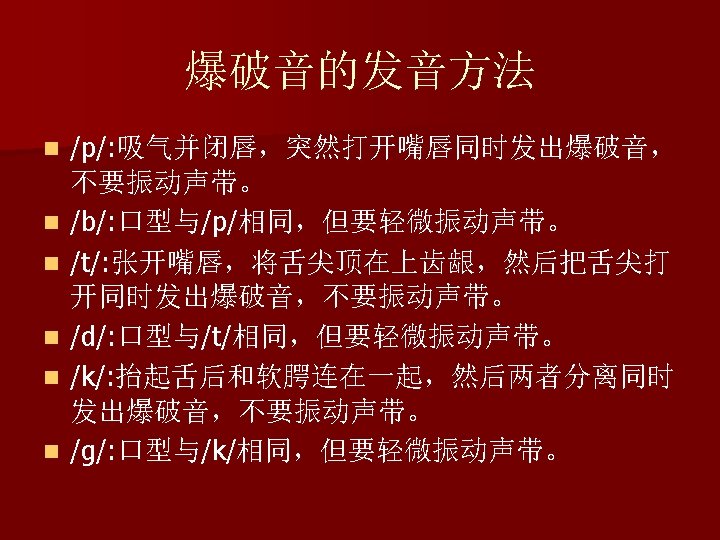 不完全爆破的发音方法 I. 爆破音+爆破音 active/ blackboard/ September/ put down/ stop talking/take care II. 爆破音+摩擦音 old friends/ a bright future/ get there/ a big zoo III. 爆破音+破擦音 white chalk/ a good try/ a cold drink