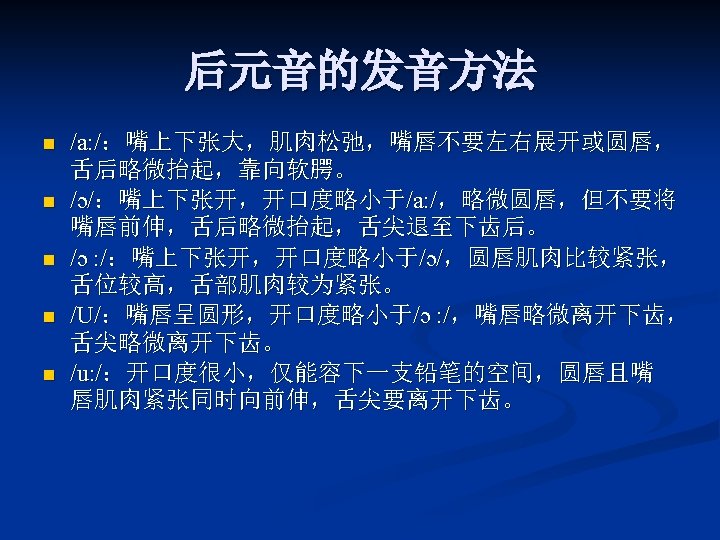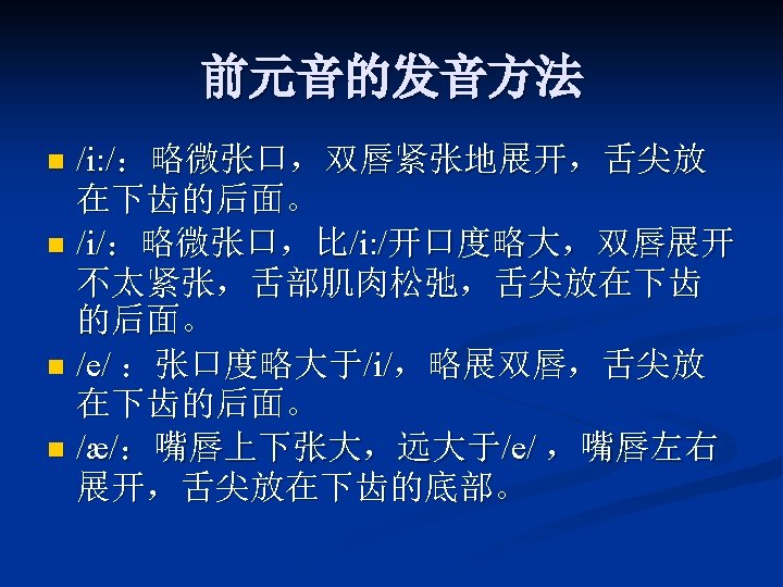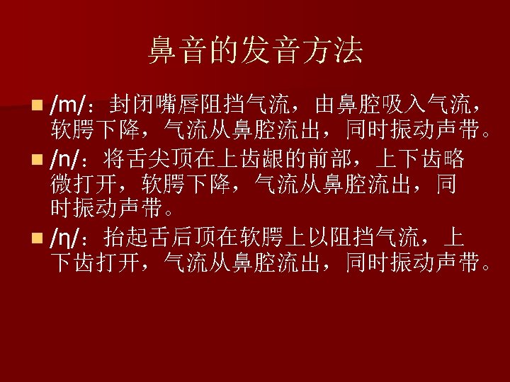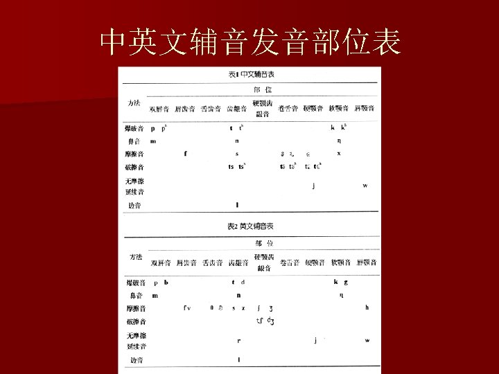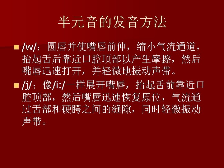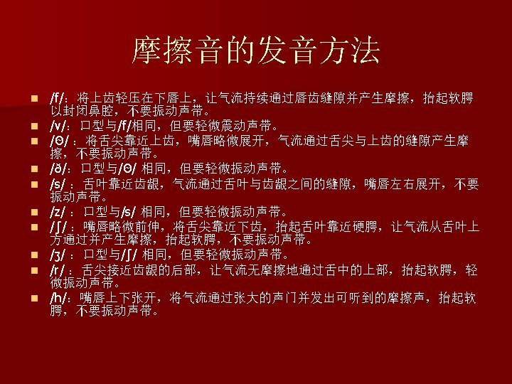 英语辅音的分类 • • • Plosive consonants(爆破音): /p, b, t, d, k, g/ Fricative consonants(摩擦音): /f, v, ð, Ѳ, s, z, ʃ, ʒ, r, h/ Affricate consonants(破擦音): /tʃ, dʒ, tr, dr, ts, dz/ Nasal consonants(鼻音): /m, n, η / Lateral consonants(舌侧音): /l/(另有模糊音) Semi-vowels(半元音): /w, j/