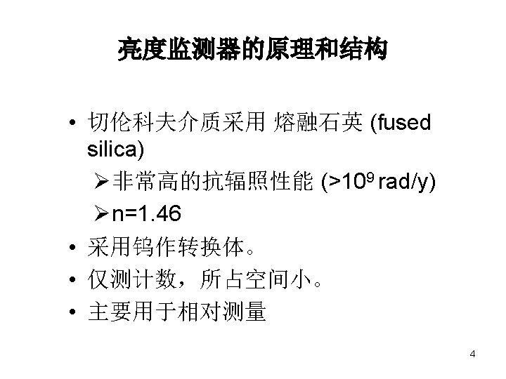 亮度监测器的原理和结构 PM 钨 fused silica T Lig pip ht e 钨转换体厚为 1. 2 cm。 熔融石英的几何尺寸为 4. 5 x 4. 0 x 6. 6 cm 3 surrounded by tungsten shield 5