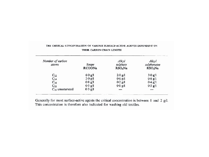 Čištění historických textilií Vzrůst účinnosti čištění (vlna) 1. Primární alkylsulfát (n-alkohol sulfát RSO 4 Na). 2. Alkyl polyglykol ether (non-ionic RC 6 H 4(OC 2 H 4)x. OH). 3. Alkyl aryl sulfonát (dodecylbenzen sulfonát RC 6 H 4 SO 3 Na). 4. Sekundární alkylsulfát (tridecylsulfát C 13 H 27 SO 4 Na). 5. Kondenzační produkty mastných kyselin (oleyl methyltaurin C 17 H 33 CON(CH 3)C 2 H 4 SO 3 Na). 6. Alkyl sulfonát (RSO 3 Na).