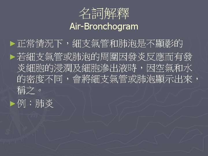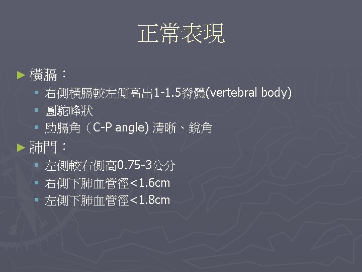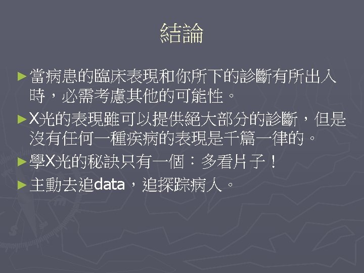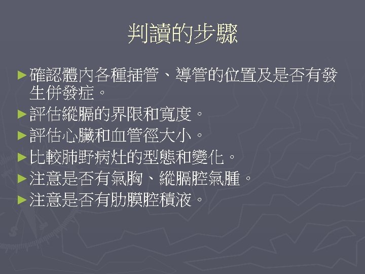 判讀的步驟 ► A: Airway ► B: Bone ► C: Cardiac, mediastinum and hilar ► D: Diaphragm ► E: Else (soft tissue, pleura, breast…) ► F: Lung Field