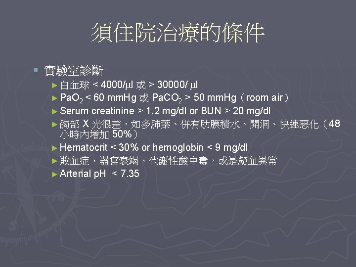 須住院治療的條件 ► 原則上,病人有多項危險因子,病情複雜者,都要 住院治療。 ► The Pneumonia Patient Outcomes Research Team (PORT) risk factors (Wishwa N Kapoor : Agency for Health Care Policy and Research, 1997): § 65 歲以上 § 其他並存的疾病如COPD、Bronchiectasis 、Malignancy 、 DM 、CRF 、CHF 、 Chronic liver disease 、 Chronic alcohol abuse 、Malnutrition 、CVA 、 Postsplenectomy.