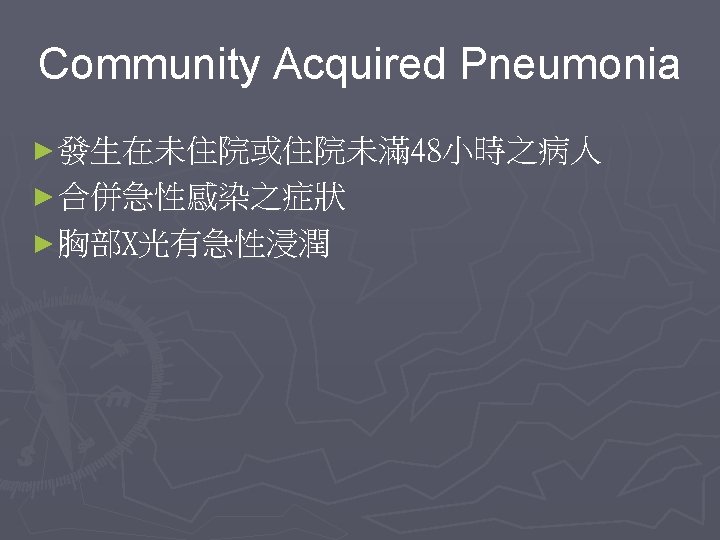 發生CAP的危險因子 ► 年長者 ► 同時存在的疾病 § COPD § DM § Renal insufficiency § CHF § CAD § Malignancy § Chronic neurological disease § Chronic liver disease