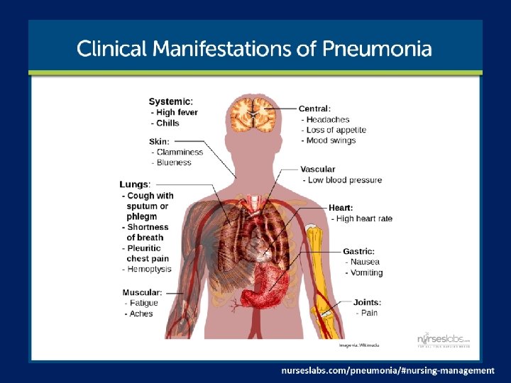 Nursing interventions • • Improve airway patency Rest to conserve energy Maintenance of proper fluid volume Maintenance of adequate nutrition nurseslabs. com/pneumonia/#nursing-management