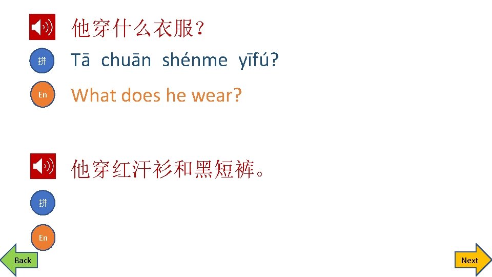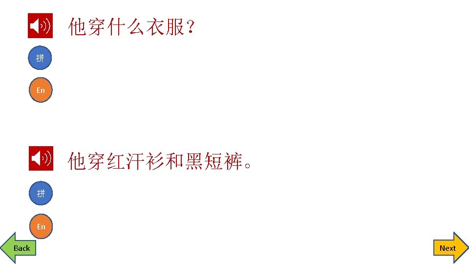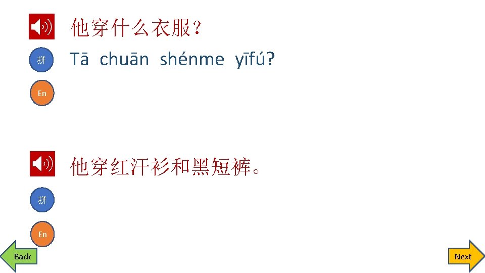 拼 En 他穿什么衣服? Tā chuān shénme yīfú? What does he wear? 他穿红汗衫和黑短裤。 拼 En Back Tā chuān hóng hànshān hé hēi duǎnkù。 Next