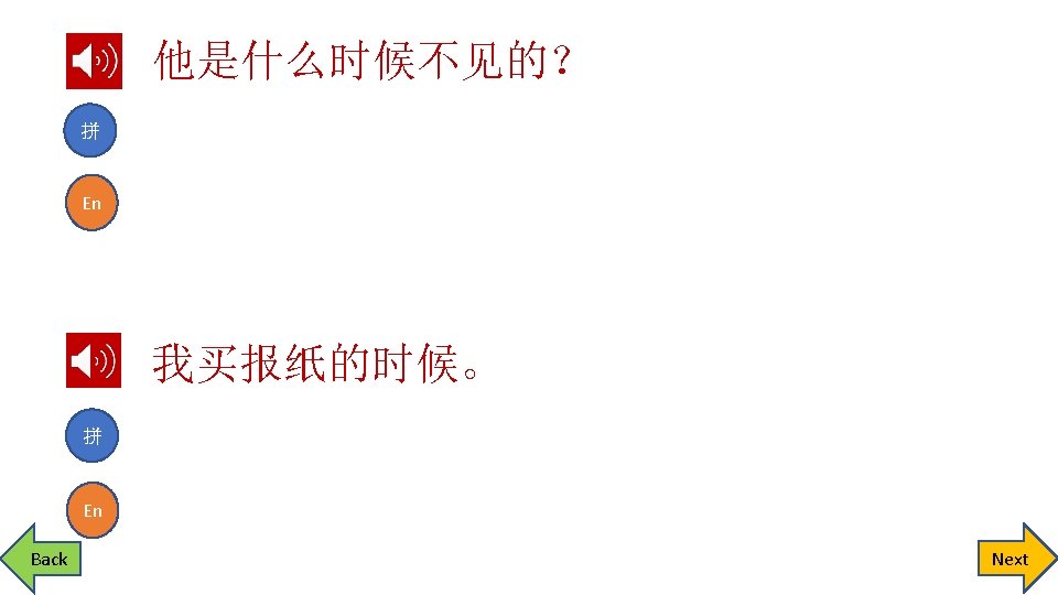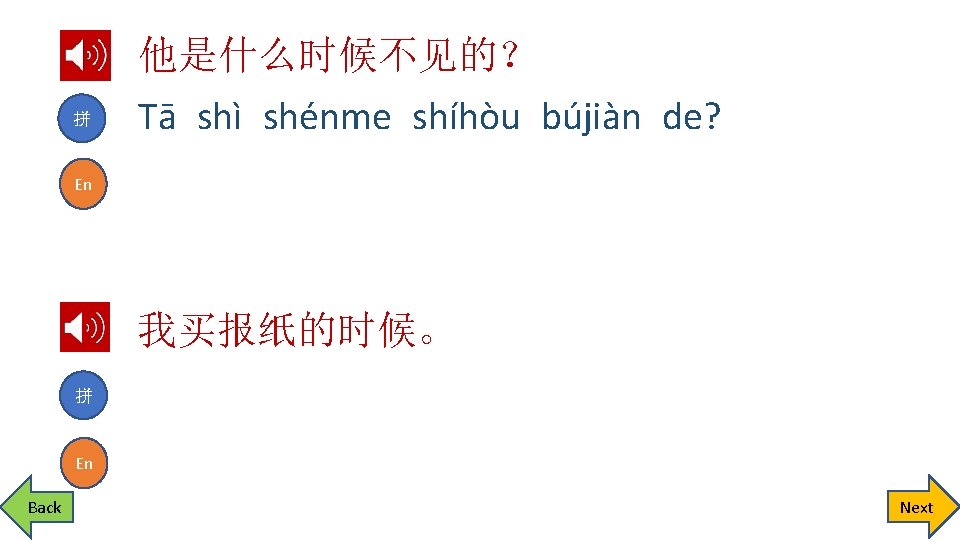 拼 En 他是什么时候不见的? Tā shì shénme shíhòu bújiàn de? When did you lose him? 我买报纸的时候。 拼 En Back Next