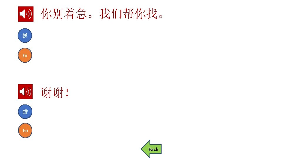 你别着急。我们帮你找。 拼 Nǐ bié zhāojí。Wǒmén bāng nǐ zhǎo。 En Don’t worry. We’ll help you look. 拼 En 谢谢! Xièxie! Thank you! Back