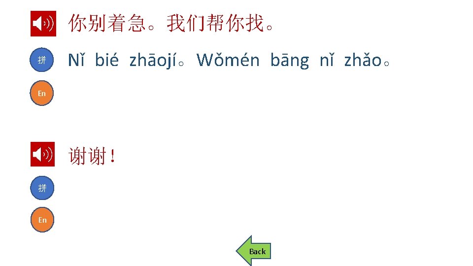 你别着急。我们帮你找。 拼 Nǐ bié zhāojí。Wǒmén bāng nǐ zhǎo。 En Don’t worry. We’ll help you look. 谢谢! 拼 En Back