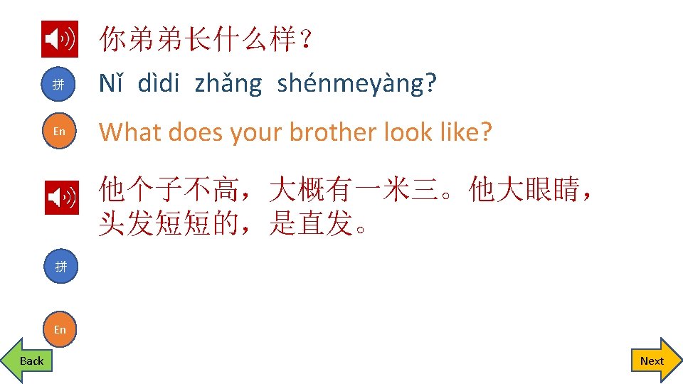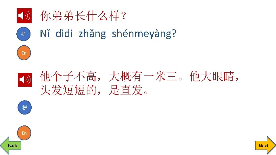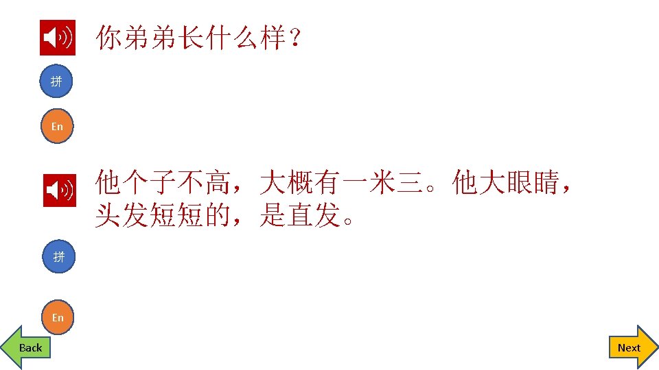 拼 En Back 你弟弟长什么样? Nǐ dìdi zhǎng shénmeyàng? What does your brother look like? 他个子不高,大概有一米三。他大眼睛, 头发短短的,是直发。 Tā gèzi bùgāo,dàgài yǒu yì mǐ sān。Tā dàyǎnjīng,tóufǎ duǎnde,shì zhífǎ。 He’s not tall, about 130 cm. He has big eyes, short, straight hair. Next
