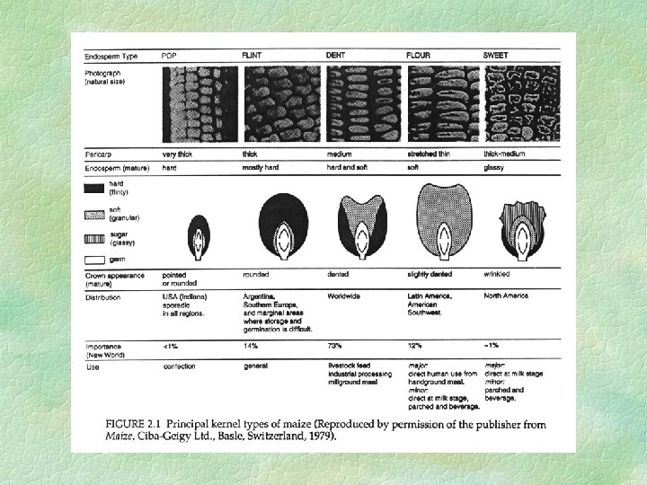 F. Many endosperm types developed by selection 1. DENT (USA, N. Mexico): large kernels with central core of floury endosperm which shrinks upon drying 2. FLINT (Argentina, Africa): large smooth kernels with mainly hard endosperm but with small floury center A. POP (IO, NE, Central Mexico): small smooth kernels with hard endosperm