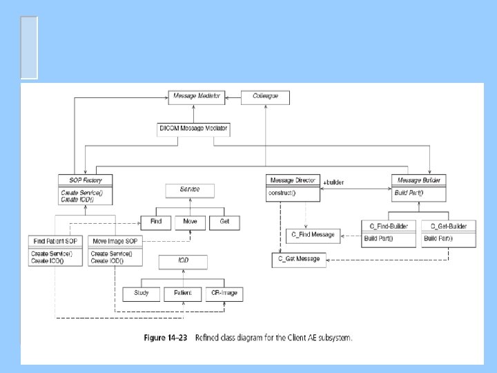 POAD Analysis for the Client Application Entity Acquaintance, Retrieval, and Pattern Selection – First, the client side application should have a graphical user interface (GUI) to make it easy for the client to interact with the client DICOM AE. n – We need to look for patterns to communicate user requests to other application entities that handle the requests or commands. n – consider the Command pattern Service Object Pairs. The creation of an SOP is not a simple procedure. Client AE may support several SOPs and service classes. n – consider the Model View Controller (MVC) pattern consider the Abstract Factory Protocol Machine. The protocol machine is responsible for building DICOM messages from DIMSE constructs. n A Builder pattern is used to facilitate the process of construction complex messages using its constituting parts.