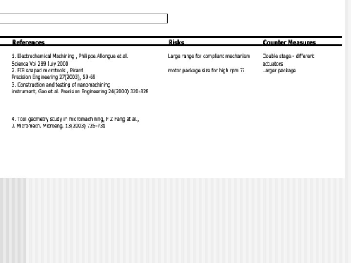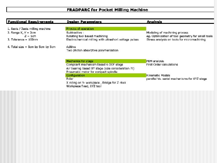 Functional Requirements n Precision XYZ micro-manipulator Range : 20 mm by 20 mm by 10 mm n Resolution : sub-micron (100 nm) n High stiffness in Z n Close loop control n High speed machine spindle (data point - a dentist drill runs at 300, 000 rpm) n n Small “pocket” size