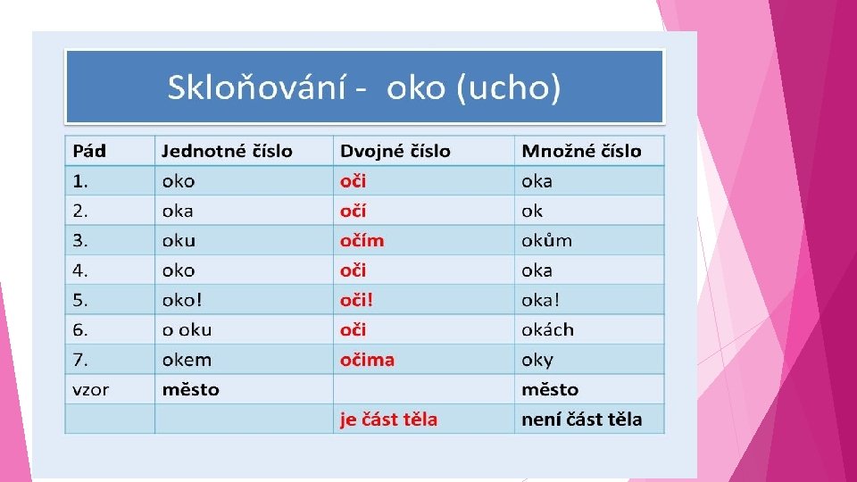 DVOJNÉ ČÍSLO (DUÁL) Ø existuje pro pojmenování párových částí těla Ø pokud podstatná jména nepojmenovávají část lidského těla, skloňují se běžně v jednotném a množném čísle