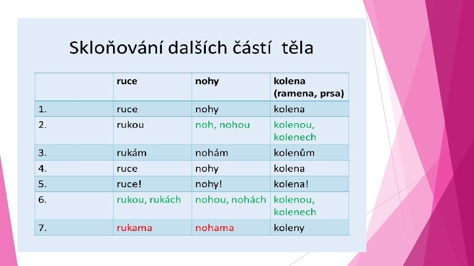 POZOR!!! Pokud nejde o části těla, skloňujeme podle vzoru: židle se čtyřmi nohami (vzor ženami) v kolenech potrubí (vzor městech)