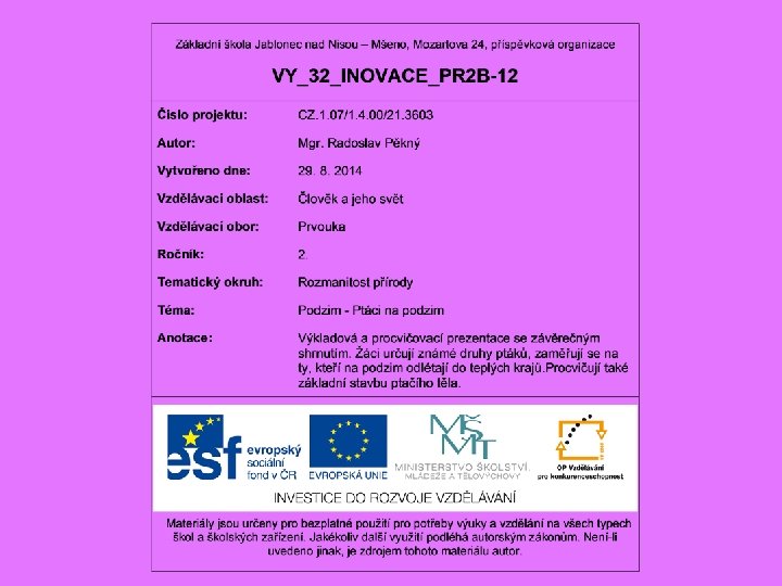 Použité zdroje: Obrázky: File: White Stork (Ciconia ciconia). jpg: čáp bílý [online]. 2005 [cit. 2014 -03 -31]. Dostupné z: https: //commons. wikimedia. org/wiki/File: White_Stork_(Ciconia_ciconia). jpg? uselang=cs File: Alauda arvensis 2. jpg: skřivan polní [online]. 2005 [cit. 2014 -03 -31]. Dostupné z: https: //commons. wikimedia. org/wiki/File: Alauda_arvensis_2. jpg File: Black-headed Gull - St James 27 s Park 2 C London - Nov 2006 edit 2. jpg: racek chechtavý [online]. 2006 [cit. 2014 -03 -31]. Dostupné z: https: //commons. wikimedia. org/wiki/File: Black-headed_Gull__St_James_27 s_Park_2 C_London_-_Nov_2006_edit 2. jpg? uselang=cs Zdroj všech ostatních obrázků je galerie Microsoft Office 2010, vlastník licence ZŠ Jablonec nad Nisou – Mšeno, Mozartova 24, příspěvková organizace.